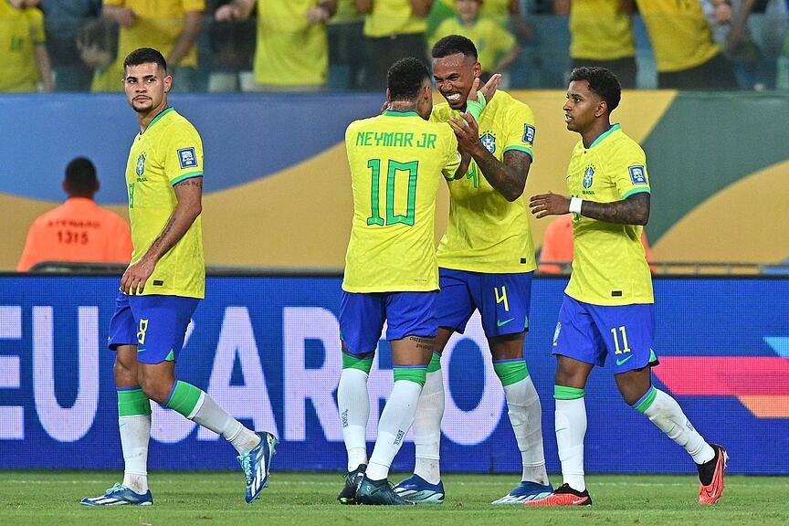 Mittlerweile verzichtet der brasilianische Superstar auf die Löcher in den Stutzen. Hier ein Bild des WM-Qualispiels vom 12. Oktober 2023 gegen Venezuela.