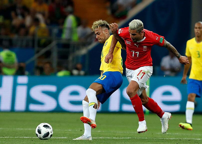 WM 2018 in Russland: Neymar (am Boden) erwischt mit Valon Behrami (links) einen unangenehmen Gegenspieler.