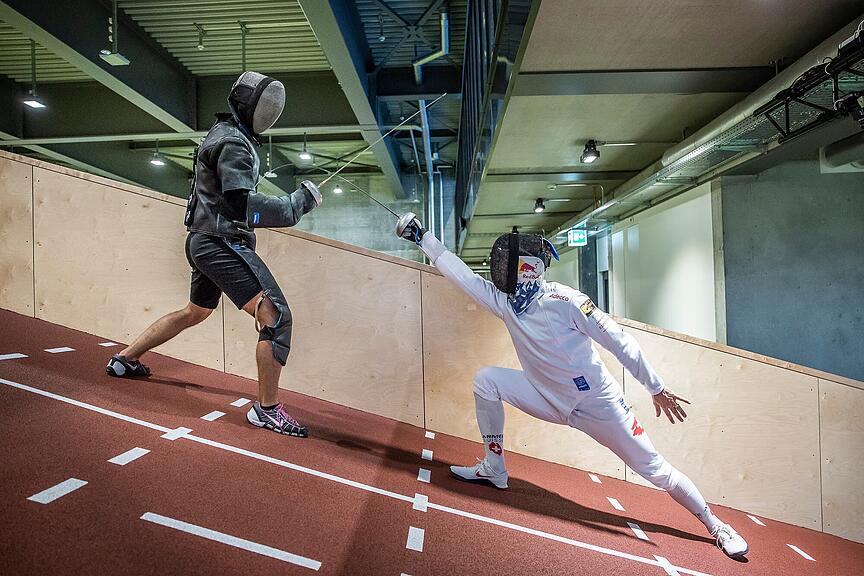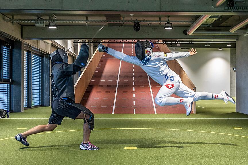 Speziell ist die schiefe Ebene, auf der Heinzer trainiert. «Fechte ich bergauf, besteht mehr Druck auf dem hinteren Bein, bergab ist die Belastung für das vordere Bein grösser. Auf diese Weise fördere ich mein Gleichgewicht und die Spritzigkeit.» Im Kraftraum wird die Belastung so ausgewählt und dosiert, damit für Heinzer stets die optimalen Adaptationsreize gesetzt werden können. «Übe ich auf herkömmliche Weise und mache zwölf Wiederholungen, komme ich erst bei den letzten Drei an die Schmerzgrenze. Hier aber wird das Gewicht ständig angepasst. Ich bin immer an der Grenze, der Muskel ist am Ende völlig leer.» Generell wird im OYM nichts dem Zufall überlassen, der ganze Körper wird immer wieder wissenschaftlich ausgemessen, um datenbasiert die nächsten Entwicklungsschritte zu vollziehen. «Auch Ruheboxen für ein Power-Nap sind eingerichtet. Bei zwei Kindern zu Hause ist dies ein Vorteil», erzählt Max Heinzer und lacht.