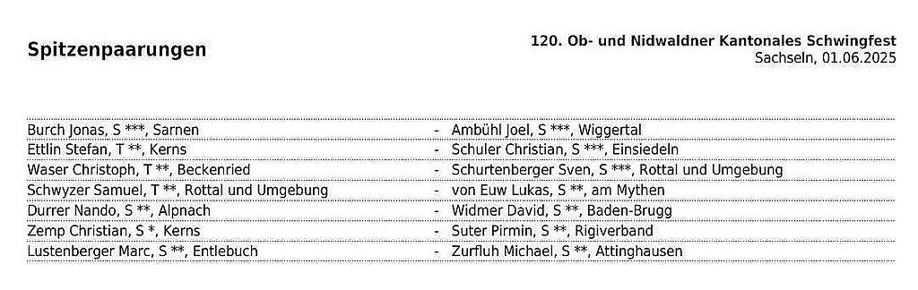 Mit Christian Schuler steht noch ein vierter Eidgenosse am Start. Der Rothenthurmer, der sich beim Luzerner Kantonalen in Root mit einem Steigerungslauf den Kranz sicherte , greift zum Start mit Stefan Ettlin zusammen. Samuel Schwyzer trifft auf Lukas von Euw, Nando Durrer auf David Widmer, Christian Zemp auf Pirmin Suter.
