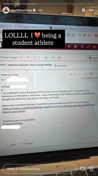 Die Kanadierin Madeline Schizas ist nicht nur Eiskunstläuferin, sondern auch Schülerin. Momentan nimmt die 20-Jährige an ihren ersten Olympischen Spielen Teil. Sie vertritt ihr Land im Team-Event wo sie am Freitag auf dem Eis performte. Gleichzeitig studiert sie Soziologie an der McMaster Universität von Ontario. Und wie sie in ihrer Instagram-Story zeigt, ist Sport und Studium nicht immer perfekt vereinbar.
