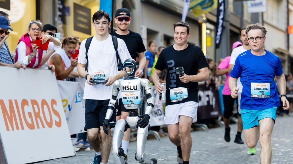 Diesen «Notausgang» beziehungsweise diese Abkürzung hatten die HSLU-Projektverantwortlichen mit den Stadtlauf-Organisatoren abgesprochen. Auch aus logistischen Überlegungen, um nicht die Spitzenläufer der nachfolgenden Kategorien zu behindern, die knapp dreimal schneller rennen als Thea (35 kg, 130 cm). Das Lauftempo ist auch einer der grossen Unterschiede im Vergleich zu Theas chinesischen Kollegen, die eine Woche vor dem Luzerner Stadtlauf am Peking- Halbmarathon den (von Menschen aufgestellten) Weltrekord gleich um mehrere Minuten pulverisierten. Ein anderer Unterschied ist, dass Thea von den HSLU-Studierenden Lorenz Barna und David Acklin begleitet und manuell gesteuert wurde, während die Roboter in Peking mit automatisierter GPS-Navigation über eine nur für sie reservierte Strecke wetzen konnten. Am Luzerner Stadtlauf – Thea startete bei den City-Runners – würde das nie funktionieren, weil das GPS-Signal in den engen Gassen zu ungenau ist. Solche für städtisches Gelände systemtypischen Unpräzisionen zeigten sich parallel zum Stadtlauf im Schweizer Fernsehen bei den Live-Tracking-Einblendungen der Orientierungslauf- Weltcup-Sprints im Tessin, wo die Laufenden scheinbar mitten durch ganze Häuser zu rennen schienen.