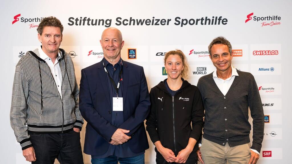 Die Co-Präsidenten der Schweizer Sporthilfe, Bernhard Heusler (rechts) und Urs Wietlisbach (links), zusammen mit Geschäftsführer Steve Schennach sowie Triathletin und Sporthilfe-Botschaftern Julie Derron .