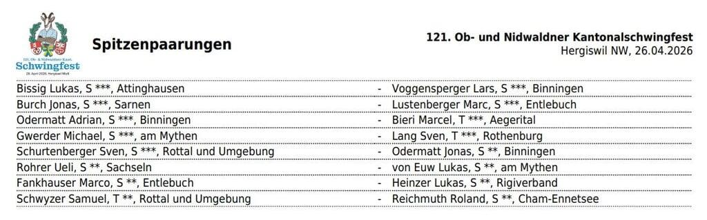 Neun Eidgenossen stehen heute in Hergiswil im Einsatz. So sehen die Spitzenpaarungen des 1. Gangs aus: