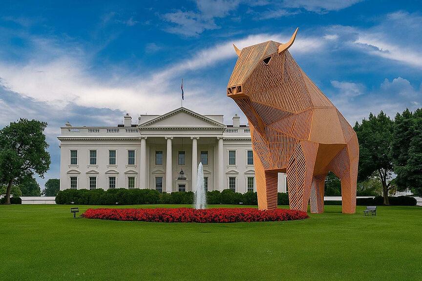 Mit Hilfe ihres Trojanischen Pferdes haben die Griechen die Trojaner überlistet. Zeit für die Schweiz, im Zollstreit mit US-Präsident Donald Trump zum Gegenschlag auszuholen. Unser trojanischer Muni wird über Nacht vor dem Weissen Haus aufgebaut, inklusive Lift und Erlebnisrestaurant im Innern. Am Morgen spaziert Ueli Maurer aus Max und lädt Trump ein zum Fondue-Plausch. Mit dabei, unterschriftsbereit, das neue Zoll-Abkommen. Am Ende des Treffens verkündet Trump begeistert: «Maaax – great story! Switzerland - great country! Taxfree – immediately!»