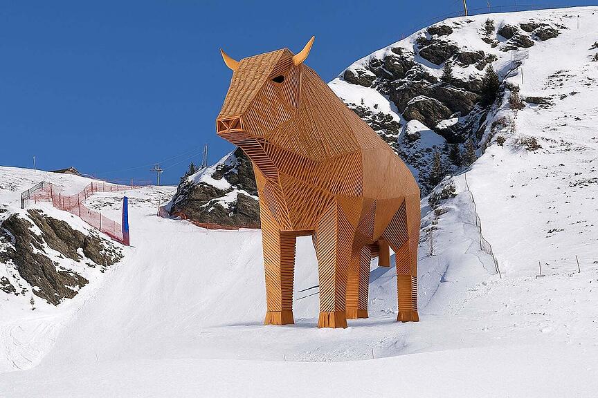 Max ist jetzt schon der Star des Eidgenössischen Schwing- und Älplerfests. Der Holzmuni, 21 Meter hoch, 182 Tonnen schwer, mit 18727 Schrauben aus 1200 Kubikmeter Holz und 4440 Einzelteilen zusammengebaut, begeistert die Menschen.