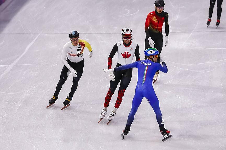 Fast hätte Pietro Sighel seinen Vorlauf im Eisschnelllauf über 500 m sogar gewonnen. Sein «Füdli» – das zeigt das Zielfoto – überquert die Ziellinie nur knapp hinter dem Schlittschuh des Gegners. Normalerweise wäre die Fahrt vorwärts auch die richtige Richtung ins Ziel. Doch Sighel wird zur halben Pirouette gezwungen, als ihn ein Gegner nach einem Sturz berührt.