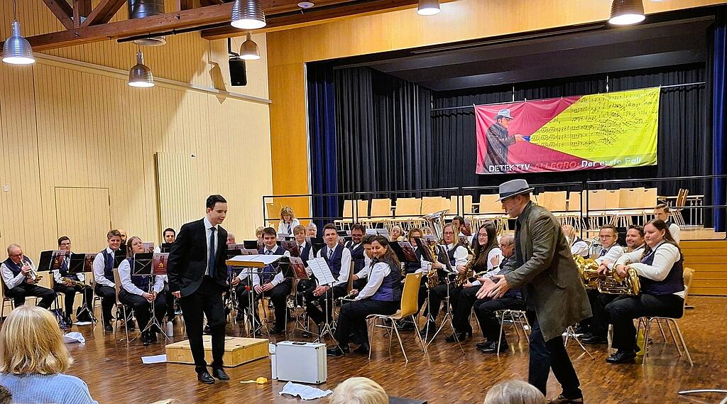Was passiert, wenn Musiknoten fehlen, zeigte die Feldmusik Gersau unter der Leitung von Florian Stadler gleich zu Beginn – ein kakophonischer Marsch erklang. So konnte es nicht weitergehen – Hilfe war gefragt! Detektiv Allegro, fantastisch dargestellt von Andri Mischol, machte sich daher gemeinsam mit den Kindern auf die Suche nach Hinweisen, um das Rätsel um die verschwundenen Noten zu lösen.