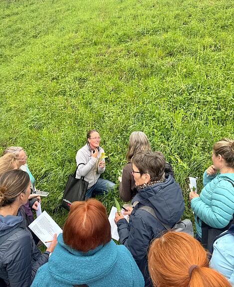 Auf der idyllischen Wiese beim Rotacher tauchten die Teilnehmerinnen in die Welt der heimischen Wildkräuter ein. Mit viel Fachwissen zeigte Jennifer Herzog, wie essbare Kräuter sicher erkannt werden können – ein zentrales Thema, da Verwechslungsgefahr besteht und achtsames Sammeln essenziell ist.