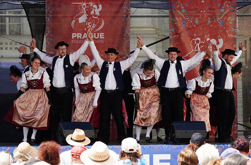 Zurück am Ufer bot Dana den Schweizer Touristen eine persönliche Führung an. Von der Prager Burg aus war der Ausblick über die Stadt sehr imposant. Vor dem Veitsdom liessen Klaus und Maria ihre Alphörner klingen. Natürlich führte die Tour über die berühmte Karlsbrücke und zum Schluss zum Altstädter Ring mit der speziellen Ratshausuhr. Nun machten sich die Aktiven für den ersten Auftritt auf der Obstmarkt-Bühne bereit; während 20 Minuten zeigte die Tanzgruppe vor einem grossen Publikum das Schweizer Brauchtum.