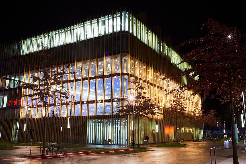 Insgesamt 750 an Stahlseilen befestigte LED-Lampen verströmen warmes Licht. Sie sind entlang der Gebäude-Fassade des Hallenbades auf der Luzerner Allmend drapiert und bilden dessen Weihnachtsbeleuchtung. Ursprünglich wurden solche Lampen für die Automobilindustrie konzipiert. Der Sterneneffekt entstehe dann durch speziell angefertigte Abdeckungskolben über den LEDs, erklärt Michèle Bucher, Leiterin Kommunikation des Hallenbades.