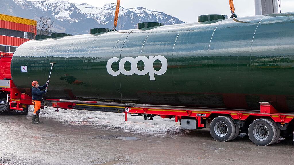 Präzisionsarbeit ist am Donnerstagmorgen in Alpnach gefragt. Auf der Baustelle der Coop-Tankstelle an der Industriestrasse wird ein Tank mit einem Fassungsvermögen von insgesamt 130’000 Litern verschiedener Kraftstoffe in eine vorbereitete Grube versenkt.