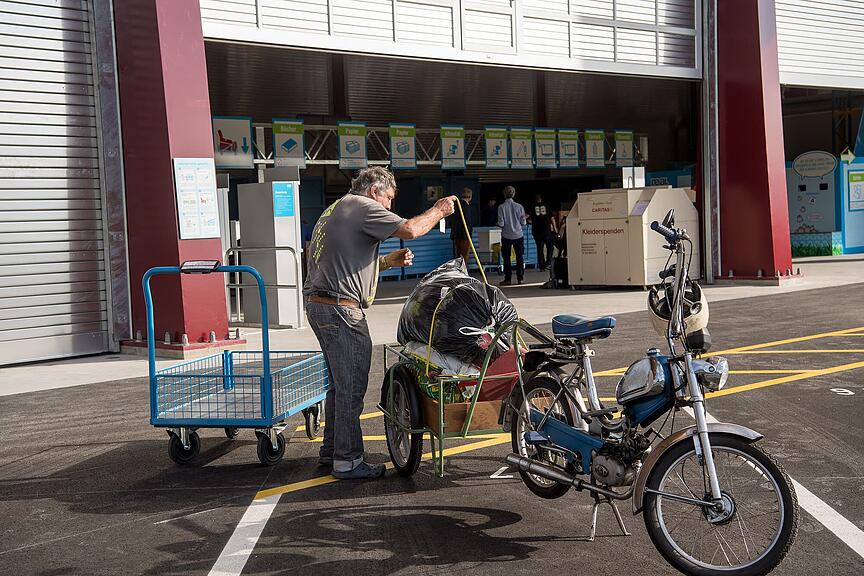 Ein Grossteil der Privatpersonen bringt den Abfall mit dem Auto ins Recyclingcenter. Vor dem Gebäude steht allerdings auch ein Parkplatz für Velos und Motorräder. Tatsächlich findet auch dieser bereits Verwendung: Eine junge Frau bringt einen Abfallsack mit dem Roller – und Andreas Rölli fährt mit einem Töffli vor. «Ich brauche den nur selten, meist bin ich zu Fuss unterwegs», so der Mann aus Emmenbrücke. Die Entsorgung von schwerem Gartenmaterial machte den Ausflug per Töffli jedoch nötig.