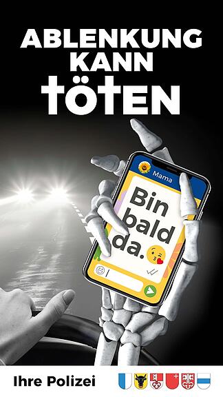 Wer hinterm Steuer mit seinem Handy hantiert, liegt mit einer Hand schon halb im Grab. Das suggeriert eine Kampagne der Zentralschweizer Polizeien, welche eine Skeletthand mit Handy und eine «lebendige Hand» am Steuer zeigt. Ihre Botschaft: Fahrlässigkeit kann tödlich enden.