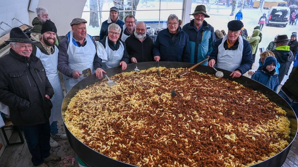Paul Hurschler hatte bis zu seiner Pensionierung als Gastgeber in der bekannten Engelberger Magronenbeiz Flühmatt unzählige Portionen der Hausspezialität Älplermagronen zubereitet. Auch für grössere Gesellschaften. «Doch das übertrifft alles», so seine Feststellung am Samstagnachmittag, als er zusammen mit Berufskollegen die Älplermagronen in der grossen Pfanne rührte. Er war der Chef am Herd, als es im Engelberger Kurpark darum ging, die grösste je in einer Pfanne zubereitete Menge Älplermagronen zu kochen.