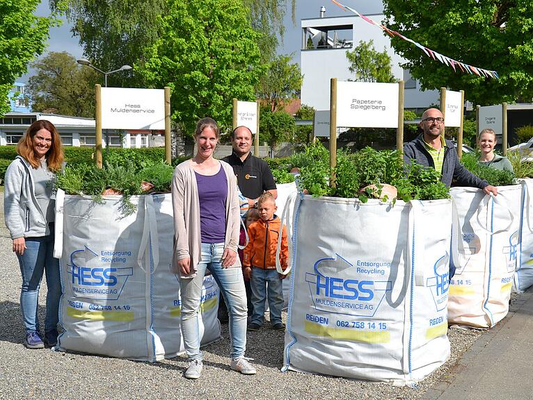 Es ist gerade einmal sieben Uhr, als sich Marietta Vogel vom Hess Muldenservice, Brigit Spiegelberg von der gleichnamigen Papeterie, Manuela Müller von der Drogerie Solaris, Simon Arnold von der Sonne-Metzg und Ueli Müller vom Blumenhaus Müller am Montagmorgen in Reiden Mitte treffen. Die fünf haben Grosses vor: Sie wollen einen Kräutergarten anlegen.