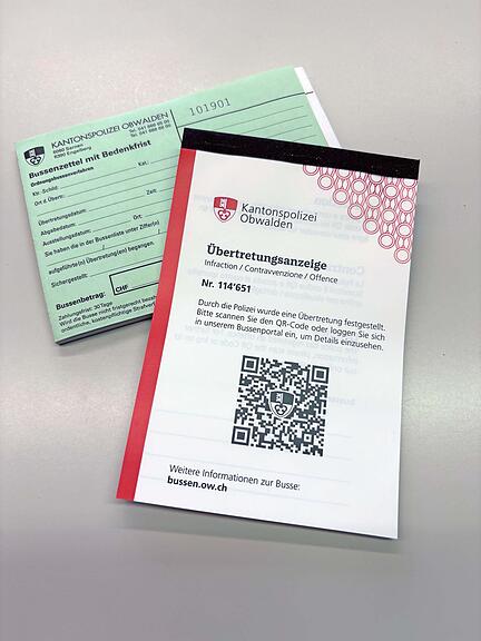 Der QR-Bussenzettel löst die klassischen Bussenzettel mit Einzahlungsschein Schritt für Schritt ab und ist bereits im Einsatz, wie die Kantonspolizei Obwalden mitteilt. Mit der Kamera des Smartphones oder Tablets wir der QR-Code gescannt. Der erscheinende Link führt zum Bussenportal. Dort müssen das Kontrollschild und die Bussenzettelnummer eingegeben werden, dann ist die Widerhandlung sichtbar. Die Busse kann mit Kreditkarte, Twint oder einer Banken-App bezahlt werden.