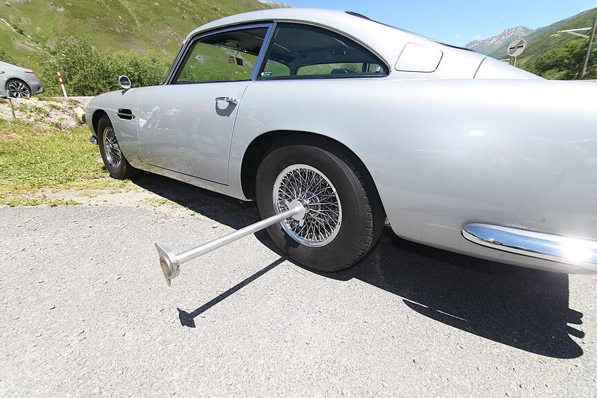 Nach einem Fotoshooting mit Ritler und den beiden Buchautoren nimmt der Aston Martin den Weg nach Andermatt. Auf der langen Geraden zwischen Realp und Zumdorf wurde der legendäre Stunt mit der ausgefahrenen Messervorrichtung gedreht, mit der Bond den Reifen seines Kontrahenten aufschlitzt. Fürs Foto haben die beiden Buchautoren eine Attrappe der Vorrichtung mitgebracht.