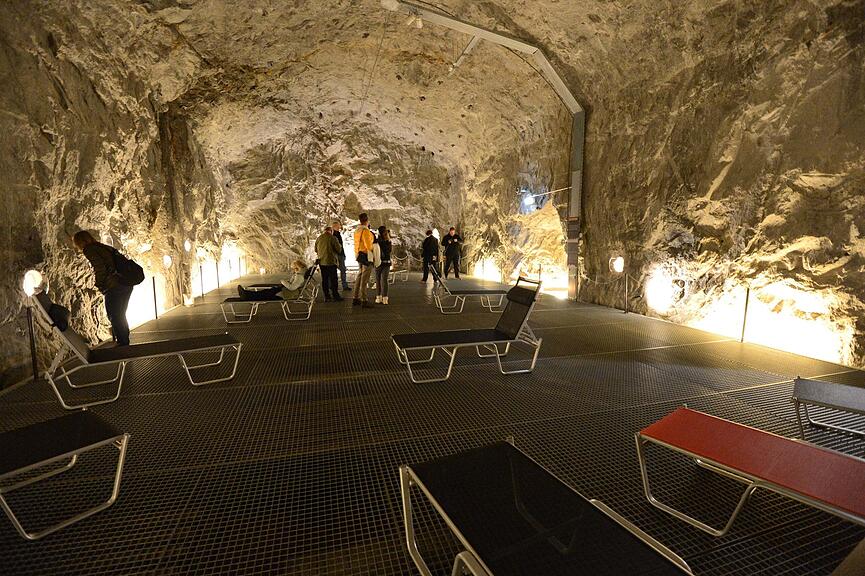 Der Rundgang führte auch in die Kristallkaverne, wo attraktive Bergkristalle und Mineralien entdeckt werden können. Letzter Programmpunkt war ein Abstecher in etwas höher gelegene Festungsgefilde. Nach einem längeren Fussmarsch durch feuchtkalte Stollen stand eine Fahrt mit der weltweit wohl einzigen Metro innerhalb einer Festung auf dem Programm. «Die Metro del Sasso ist erfahrungsgemäss für alle Besucher ein besonderes Highlight, insbesondere für Kinder», weiss Zingg. Abgerundet wurde die Führung mit einem Gang durch die historische Festung. Hier erfuhr man mehr über den strategischen Rückzugsort während des Zweiten Weltkriegs und konnte unter anderem Geschütze, Feuerleitstellen sowie auch noch eine ehemalige Truppenunterkunft besichtigen.