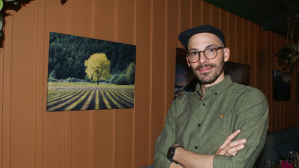 Marc Risi mit einer seiner Fotografien in der Ausstellung.