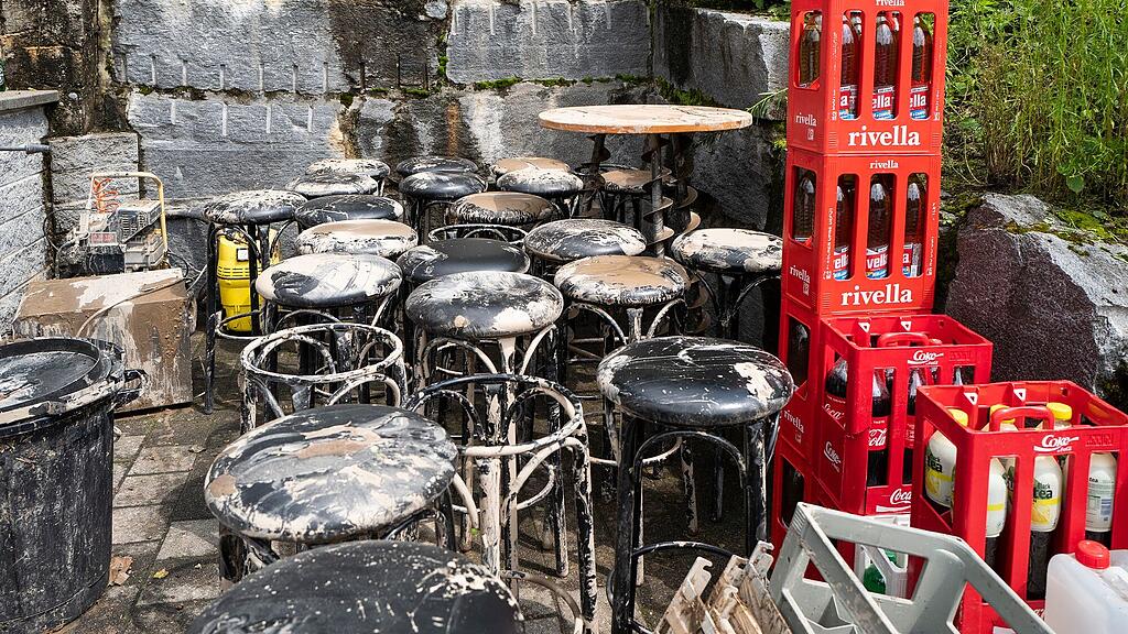 Vor dem Restaurant Bahnhöfli in Wolhusen stapelt sich alles, was im überfluteten Keller gelagert wurde. (Bilder: Patrick Hürlimann (26. Juli 2021, Wolhusen))