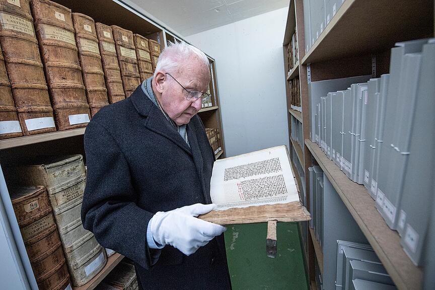 Eine Treppe führt hinunter zum klimatisierten Schutzraum. Sorgsam dreht Bernet an einem der drei Archivrollregale. Zum Vorschein kommen sogenannte Inkunabeln. Das sind Werke aus der frühen Zeit des Buchdrucks. Nicht ohne Stolz zeigt Bernet auf das älteste in der Schweiz gedruckte Buch, das 1470 in Beromünster entstand. Im Regal werden auch die mittelalterlichen Handschriftenbände gelagert, in massgeschneiderte säurefreie Kartonschachteln verpackt.