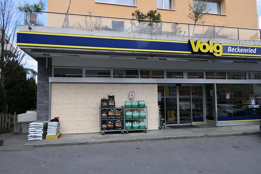 Die Volg-Filiale war bereits am Sonntag wieder regulär offen. Die zerbrochene Scheibe wurde durch Holzpaneele verdeckt.