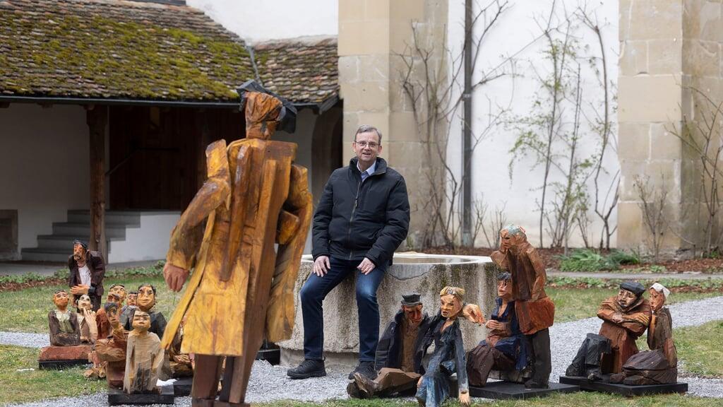 Er hat das Projekt initiiert: Thomas Inglin im Kloster Kappel am Albis. Um ihn herum die Holzfiguren des Künstlers Peter Leisinger, die derzeit im Kloster zu sehen sind.