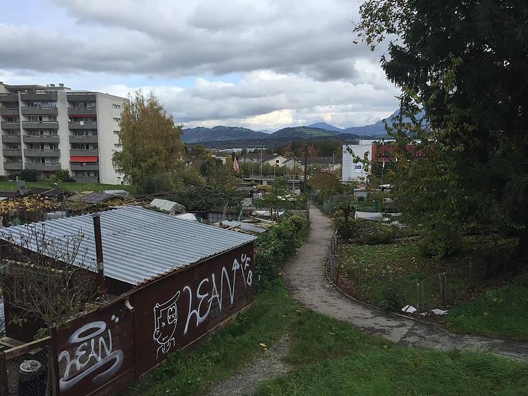 Hinter der Häuserreihe befinden sich zahlreiche Schrebergärten, die bis zur Gersagstrasse hinunter reichen: