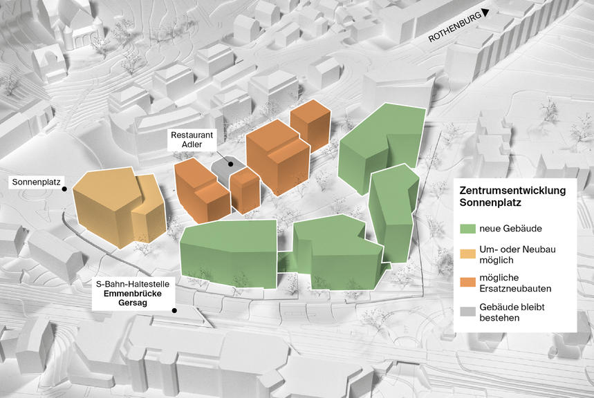 Um etwas städtebaulich Hochwertiges zu planen, sei es wichtig, über den ganzen Perimeter zu denken. Das Areal Sonne ist eines von vier Teilprojekten, mit denen das Gebiet rund um den Sonnenplatz aufgewertet und verdichtet wird. Grundlage ist ein Richtprojekt von 2016, das die Gemeinde zusammen mit dem Kanton erarbeitet hat.