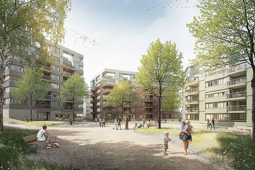 Das Areal Sonne gehört sechs verschiedenen privaten Grundeigentümern. Der mit Abstand grösste Teil – unter anderem die Schrebergärten – ist in Besitz des Zürcher Projektentwicklers Steiner. Hier sieht das Gewinnerprojekt vier Gebäude mit total 180 Wohnungen und «publikumsorientierten Erdgeschossnutzungen» vor. So stellen sich die Architekten diese Siedlung vor: