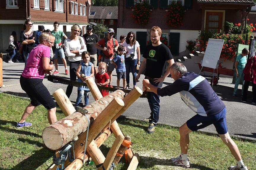 Unter den Besuchern waren zahlreiche Kinder und Jugendliche. An sechs Stationen konnte man selber Hand anlegen und üben, wie zum Beispiel bei der Bürgergemeinde das Walsägen oder das «Schnätzesel-Schnitzä» oder das Basteln mit Leder. Für Hedi Imhof war es fast zu schönes Wetter, um ihre Strickwaren zu verkaufen. Sie freute sich, dass das «Lismä» wieder beliebter wird. Seit der Schulzeit fasziniert sie das «Stricken», und sie erzählt, dass sie in der Schule immer die Bestnote 6 im «Lismä» erhalten habe. Grosses Interesse zeigten die Besucher am Korbflechten oder Holzblumenschnitzen bei Walter Tresch, und andere interessierten sich für die Betriebe von Holzbildhauer Peter Bissig, warfen einen Blick in die Schreinereien von Beat Arnold und Peter Bissig oder besuchten den Landwirtschafts- und Schreinereibetrieb Kempf.