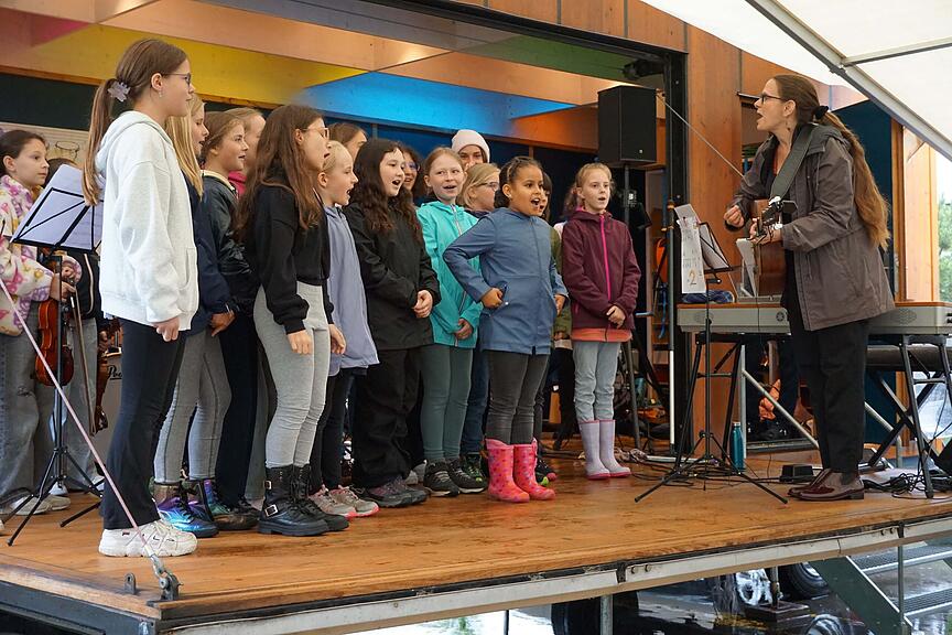 Sarah Burrell und der Kinderchor Stansstad in voller Aktion.