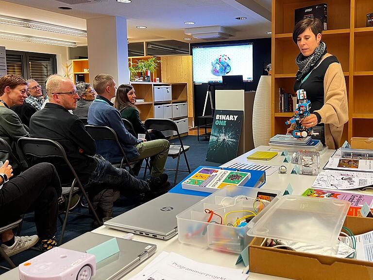 «Ich bin kein Programmiercrack, aber ich kann euch einen Einblick geben in meine Schulpraxis», betont sie vor dem interessierten Publikum. «Während in den unteren Klassen knifflige Logikspiele zur Hinführung an das Programmieren genutzt werden, kommen in den oberen Klassen spielerische Programmiersprachen zum Einsatz», erklärt Tamara Simmen.