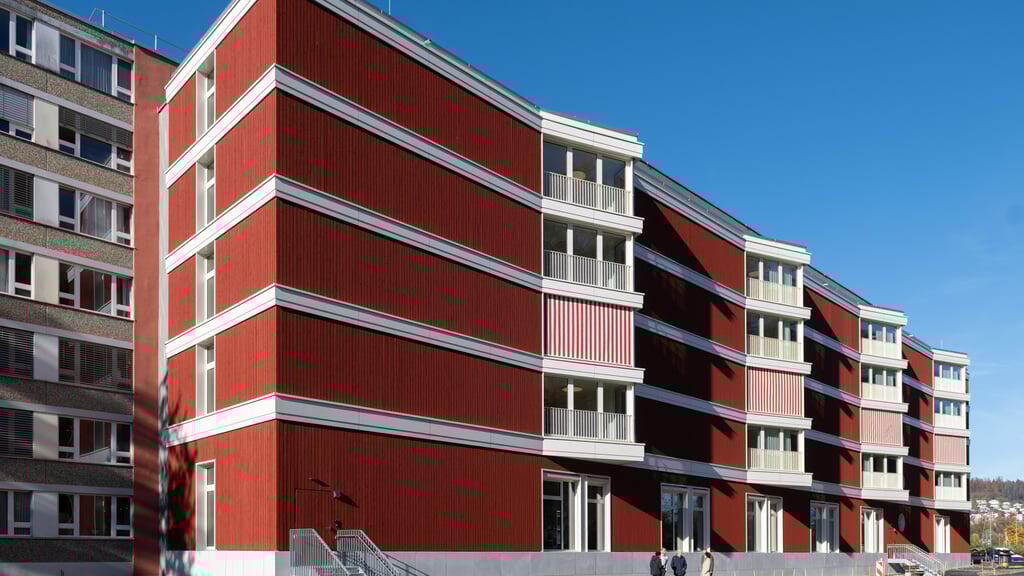 Mit seinen schwedisch roten Holzfassaden bildet der Neubau des Horwer «Blickfeld», früher Blindenheim genannt, einen wohltuenden Farbtupfer inmitten der vielen eher grauen Neubauten rundherum. Vor dem Gebäude mit dem Namen Aura laufen letzte Bauarbeiten: So wird der Rundweg für die Sehbehinderten und Bewohnenden wieder hergestellt und geteert.