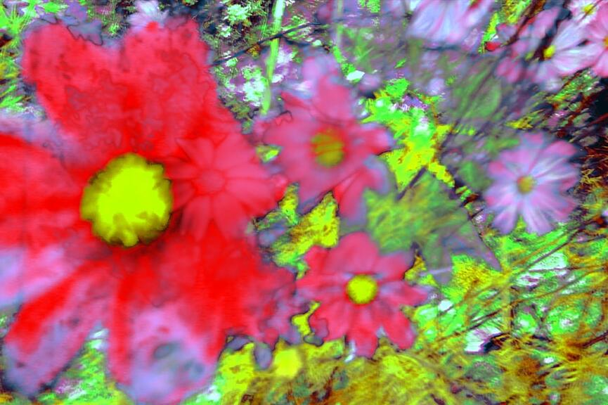 Nebst den Marienbildern und dem Video «Madonna» werden in der Ausstellung in Stans auch Blumenbilder von Annelies Štrba gezeigt. Psychedelische Farbkombinationen würden «Gärten und Blumen in Traumwelten verwandeln, die man staunend betritt – und in denen man lustvoll verweilt», heisst es dazu.