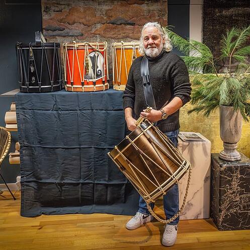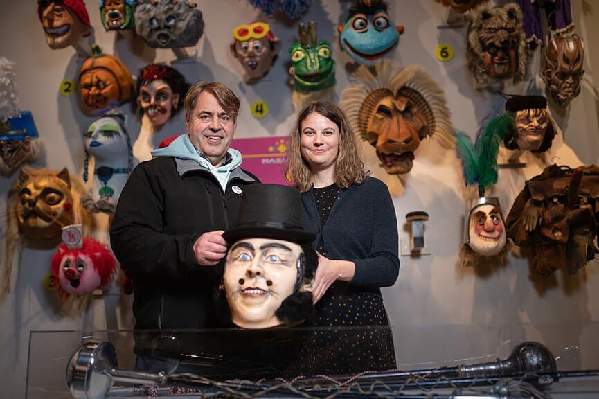 Im Historischen Museum in Luzern fand 2024 eine Sonderschau zum 60-jährigen Bestehen der Vereinigten Guuggenmusigen Luzern, kurz «Vereinigte», statt. Im Bild: Kuratorin Sophia Aschwanden und Vereinigte-Präsident Robert Marty inmitten der Ausstellung.