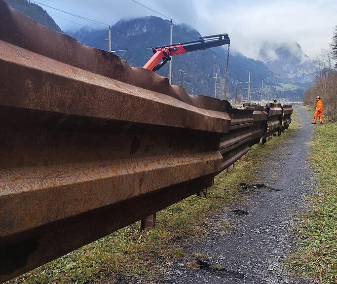 Aus Sicherheitsgründen und um das darunterliegende Gebiet zu schützen, wird der Wanderweg Richtung Bruust-Schwandi entlang der Kantonsstrasse südlich der Passerelle bis Unterführung Steinbruch ab sofort bis auf Weiteres gesperrt. Um den Autoverkehr auf der Kantonsstrasse zu schützen, wurden entlang der Kantonsstrasse Stahlpalisaden errichtet, welche die Gesteinsmassen bei einem Absturz auffangen sollen. (zvg)