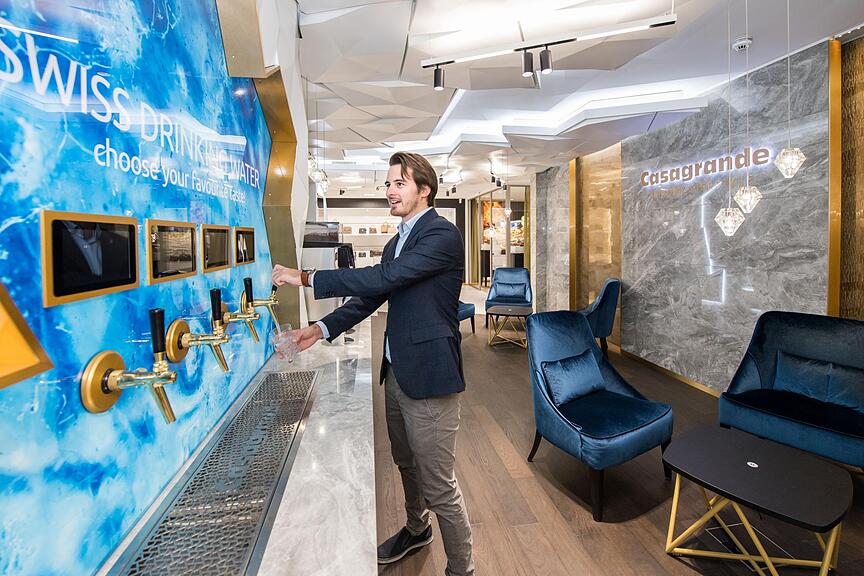 An den vormaligen Schuhladen erinnert nichts mehr: Im Erdgeschoss befindet sich die einzige «Tag Heuer»-Boutique Luzerns – laut Robert Casagrande eine der grössten weltweit. Daneben werden Koffer der Marke «Rimowa» verkauft – zum Teil für mehr als 1000 Franken. Eine geschwungene, offene Treppe führt ins Obergeschoss, wo helle Materialien verarbeitet wurden. «Die Decke soll an einen Gletscher erinnern», erklärt Fabrice Casagrande. Das Element Wasser zieht sich durch das ganze Ladenlokal: Vom echten Moos auf den Toiletten, über vier verschiedene Wasserhähne im Lounge-Bereich bis zum Swarovski-Leuchter bei der Treppe, der an einen Wasserfall erinnern soll. «Wasser ist ein typisches Schweizer Qualitätselement, das im Ausland oft als wahrer Luxus angesehen wird. Darum passt es perfekt in unseren neuen Laden», sagt Fabrice Casagrande.