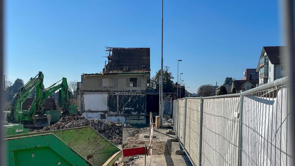 Eingepfercht zwischen den Bahngleisen und der Hauptstrasse befanden sich an der Zugerstrasse 64, 66 und 68 in Cham einst vier Gebäude. Davon ist nicht mehr viel übrig. Seit Ende Januar fressen sich Schaufeln grüner Bagger in ihre Fassaden und reissen sie brockenweise nieder. Vom langen Gebäude, in dem sich einst der Denner, später ein Aquariumsladen und schliesslich ein Lokal für asiatische Speisewaren befand, ist nichts mehr zu sehen.