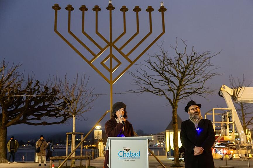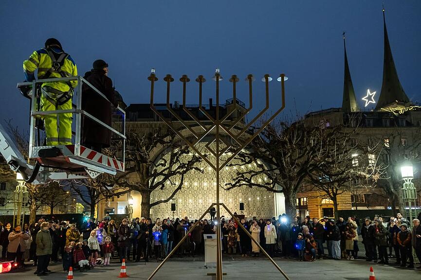 Auf Einladung der jüdischen Gemeinschaft «Chabad Lubavitch» Zentralschweiz nahmen am Sonntag gegen 100 Personen am feierlichen Lichterritual rund um den etwa sechs Meter grossen Chanukka-Leuchter teil. Erstmals fand die eindrückliche Feier nicht vor dem Torbogen beim Luzerner Bahnhof, sondern beim Musikpavillon auf dem Kurplatz am Nationalquai statt. Die Festfreude war allerdings getrübt durch das gleichentags bekannt gewordene Attentat in Sydney, bei dem an einer jüdischen Chanukka-Veranstaltung 16 Menschen getötet wurden.