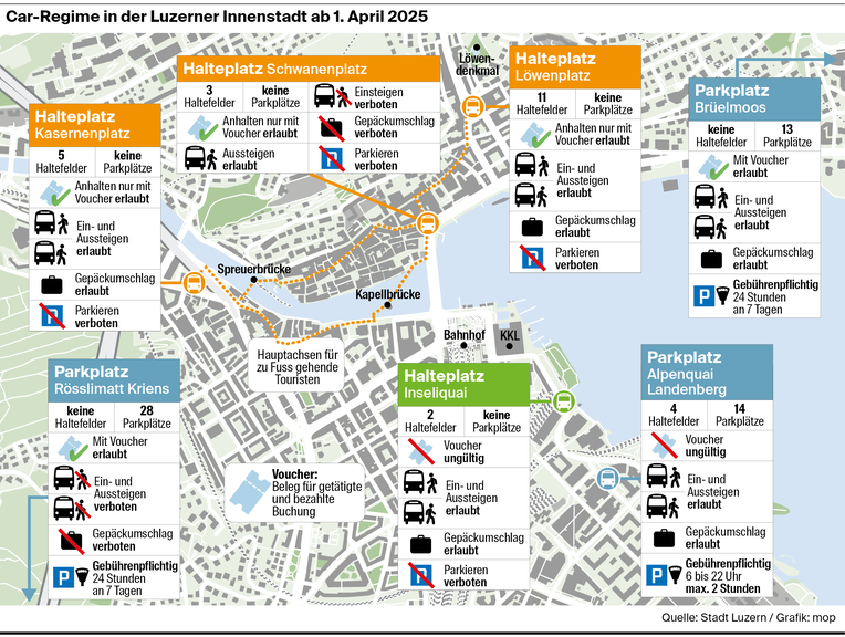 Es ist kein Aprilscherz – ab Dienstag, 1. April, müssen Carlenkende, die in Luzern auf dem Schwanen-, Löwen- oder Kasernenplatz stoppen wollen, dies vorgängig online buchen. Die angekündigte Haltegebühr von 100 Franken berechtigt zu je einmal Aus- und Einsteigenlassen der Fahrgäste an einem der drei Plätze sowie zu 24 Stunden Parkierung auf den Reisebusparkplätzen Brüelmoos in Luzern und Rösslimatt in Kriens. Wobei am Schwanenplatz nur noch Aussteigen erlaubt ist.
