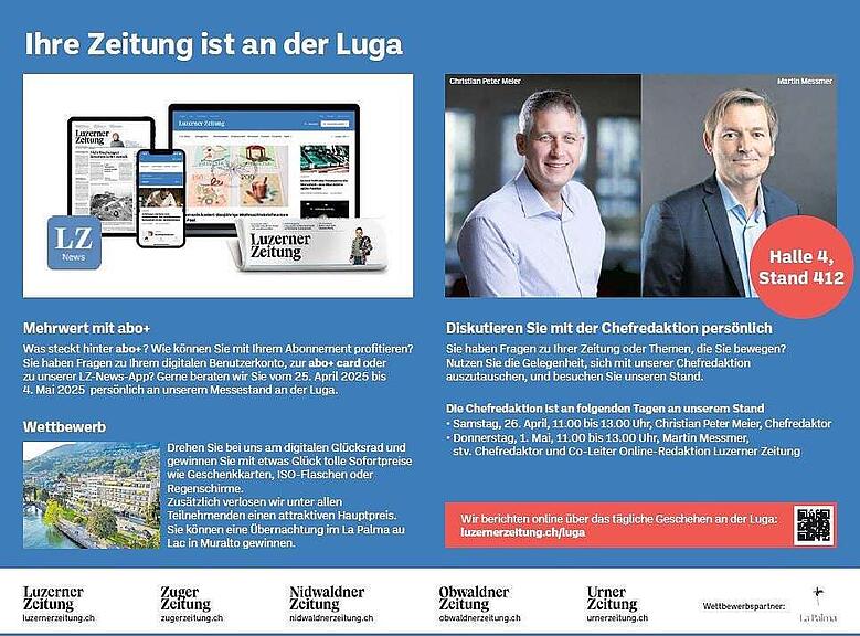 Auch die Luzerner Zeitung ist in diesem Jahr wieder an der Luga dabei. Drehen Sie in der Halle 4 beim Stand 412 am Glücksrad und gewinnen Sie Sofortpreise wie Geschenkkarten, Iso-Flaschen oder Regenschirme. Zudem ist die Chefredaktion am 26. April von 11 bis 13 Uhr mit Christian Peter Meier (Chefredaktor) und am 1. Mai von 11 bis 13 Uhr mit Martin Messmer (stellvertretender Chefredaktor und Co-Leiter Online-Redaktion) vor Ort.