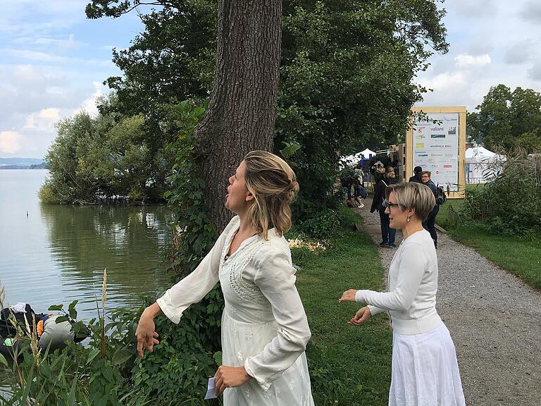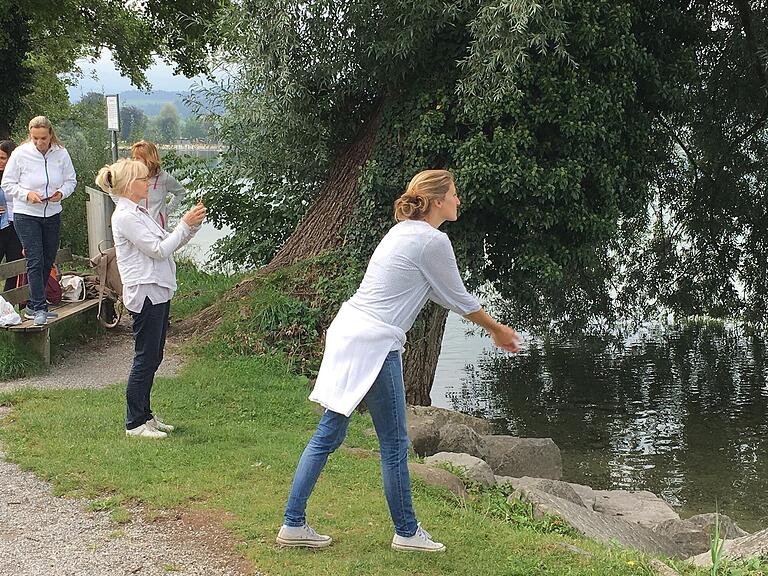 Jetzt wirft jede Teilnehmerin einen Kieselstein in den Sempachersee. Das Ziel der Aktion: Hohe Wellen schlagen.