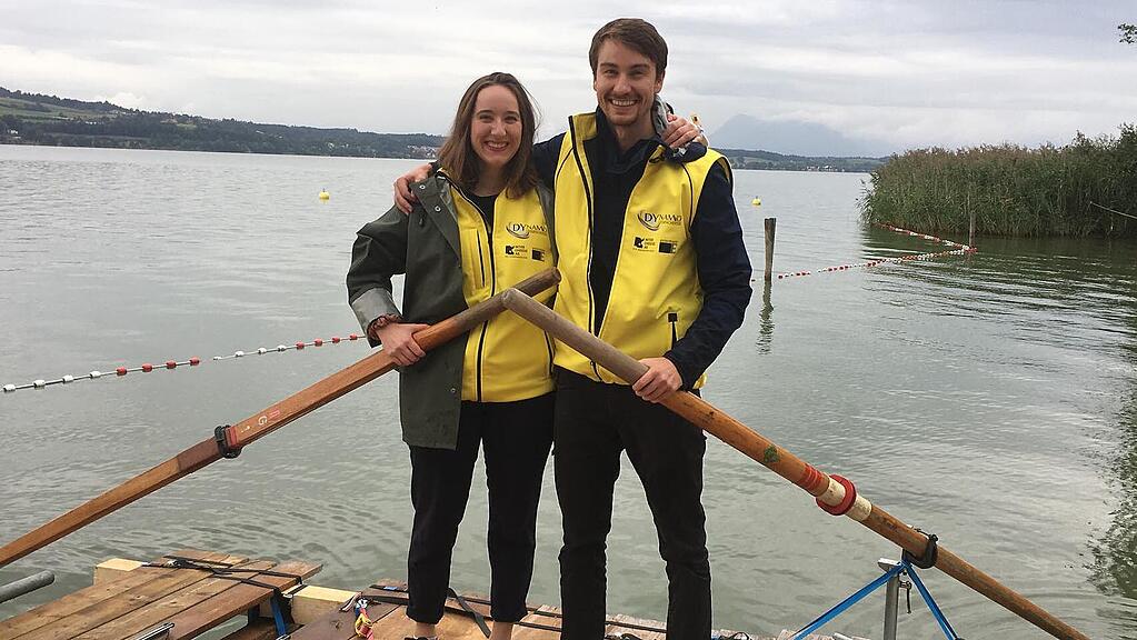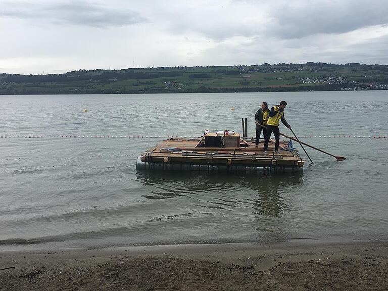 Unterdessen auf dem See: Dominik und Yvonne Roos helfen heute, die Besucher mit dem Floss über das Wasser zu fahren. Hier posieren sie auf dem Floss: