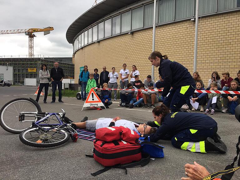 Vor dem Paraforum wird dem Publikum der Beruf des Rettungssanitäters vorgestellt. «Es geht um einen Velounfall», erklärt Corina Brenner von der Organisation Sirmed, die durch die Übung führt. Folgende Situation wird gezeigt: Ein Bub liegt am Boden, in einem blutigen T-Shirt, ein anderer Bub ruft die Nr 144 an. «Wir zeigen euch nun wie der Beruf des Rettungssanitäter aussieht», erzählt Brenner.