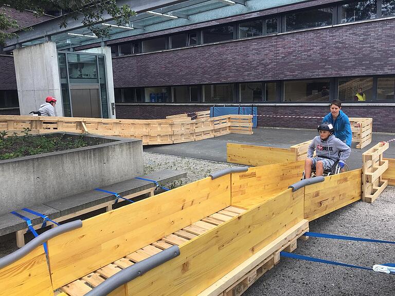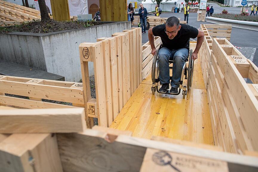 Über und durch das Gerüst aus Holz führt der Rollstuhlparcours. Personen, die nicht auf einen Rollstuhl angewiesen sind, können sich in der Überwindung von Hindernissen üben. Dabei werden Hindernisse ersichtlich, die sich einer querschnittgelähmten Person im Alltag stellen.
