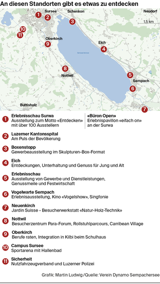 An zwölf Standorten rund um den Sempachersee können Besucher Ausstellungen, Stände und auch Parcours entdecken. Das Motto der Ausstellung lautet demnach auch: «Bewegen, entdecken, geniessen». Alle Informationen rund um das Dynamo finden Sie auch auf der offiziellen Webseite.