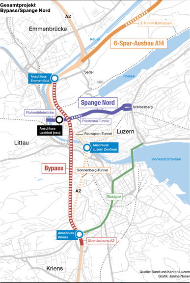 Bypass und Spange sollen verkehrstechnisch ein Gesamtsystem bilden. Erstgenanntes Projekt wird vom Bund, letztgenanntes vom Kanton Luzern realisiert. Der Spange Nord stehen noch politische Bewährungsproben bevor. In der Stadt Luzern ist der Autobahnzubringer sehr umstritten, die SP hat die Lancierung einer Gegeninitiative beschlossen (wir berichteten). Der Kanton prüft derweil sechs bauliche Varianten. Hat man sich für eine entschieden, wird letztendlich das Stimmvolk über den Projektkredit befinden.