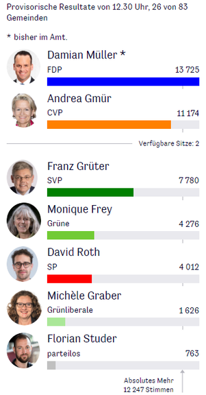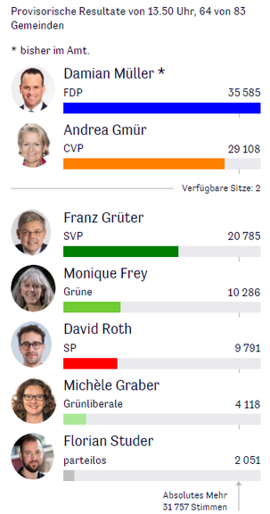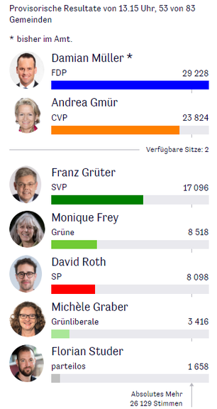 Ständerat Luzern: Damian Müller (FDP) liegt klar in Führung, gefolgt von Andrea Gmür (CVP) und Franz Grüter (SVP). Die Zahlen: